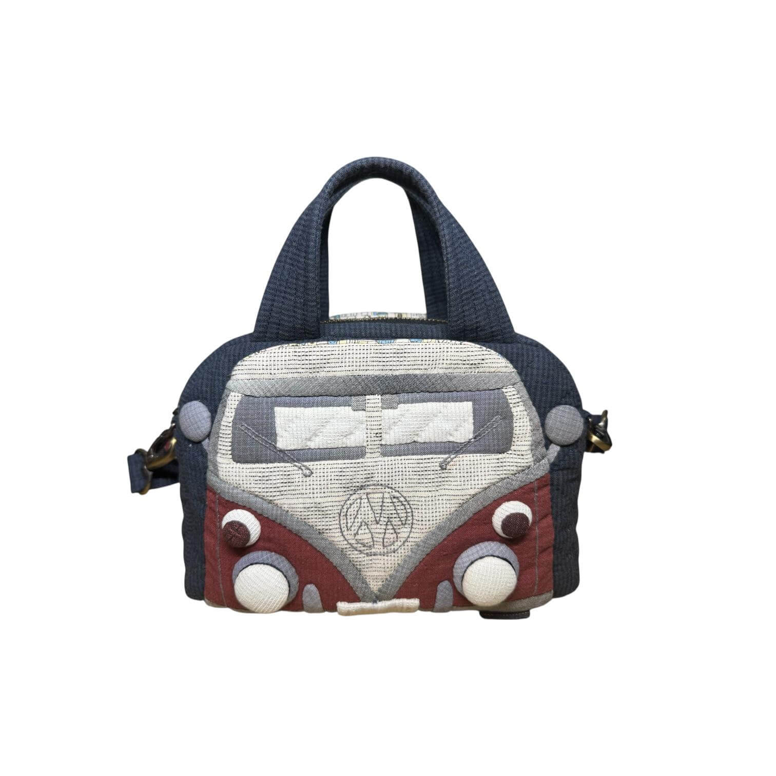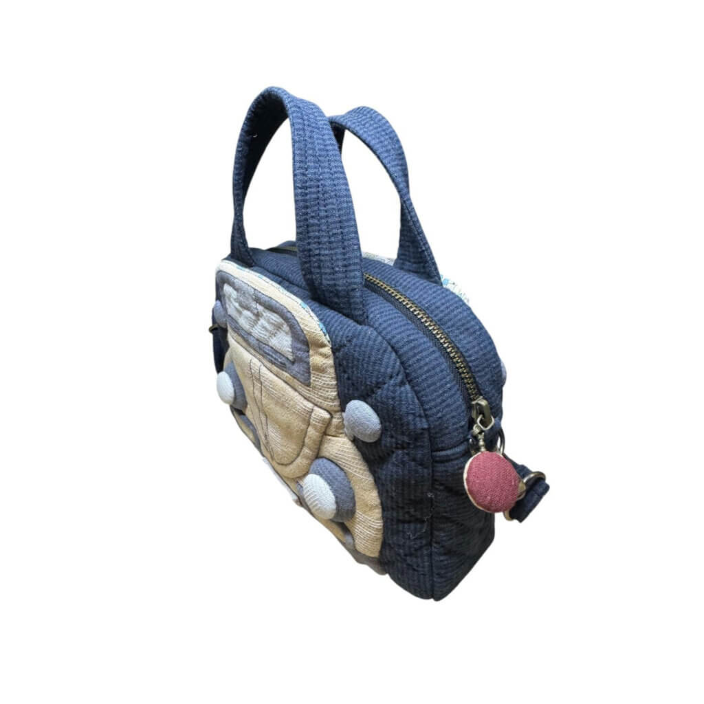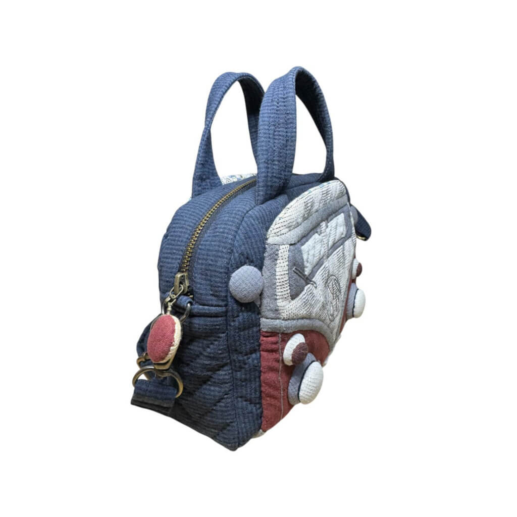 Made with textured fabric and layered quilting, the applique design gives the bag a soft dimensional look while keeping the structure neat and compact. The combination of deep charcoal, cream, and red tones recreates the classic camper van aesthetic while still remaining versatile enough to pair with everyday outfits.