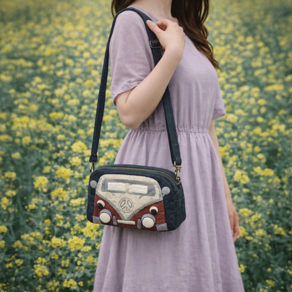 Playful retro camper van crossbody bag (22cm x 11cm x 6cm) featuring a detailed quilted van front with headlights and peace symbol. Compact, lightweight, and perfect for everyday essentials. Discover more handmade bags at https://bloomselection.com
