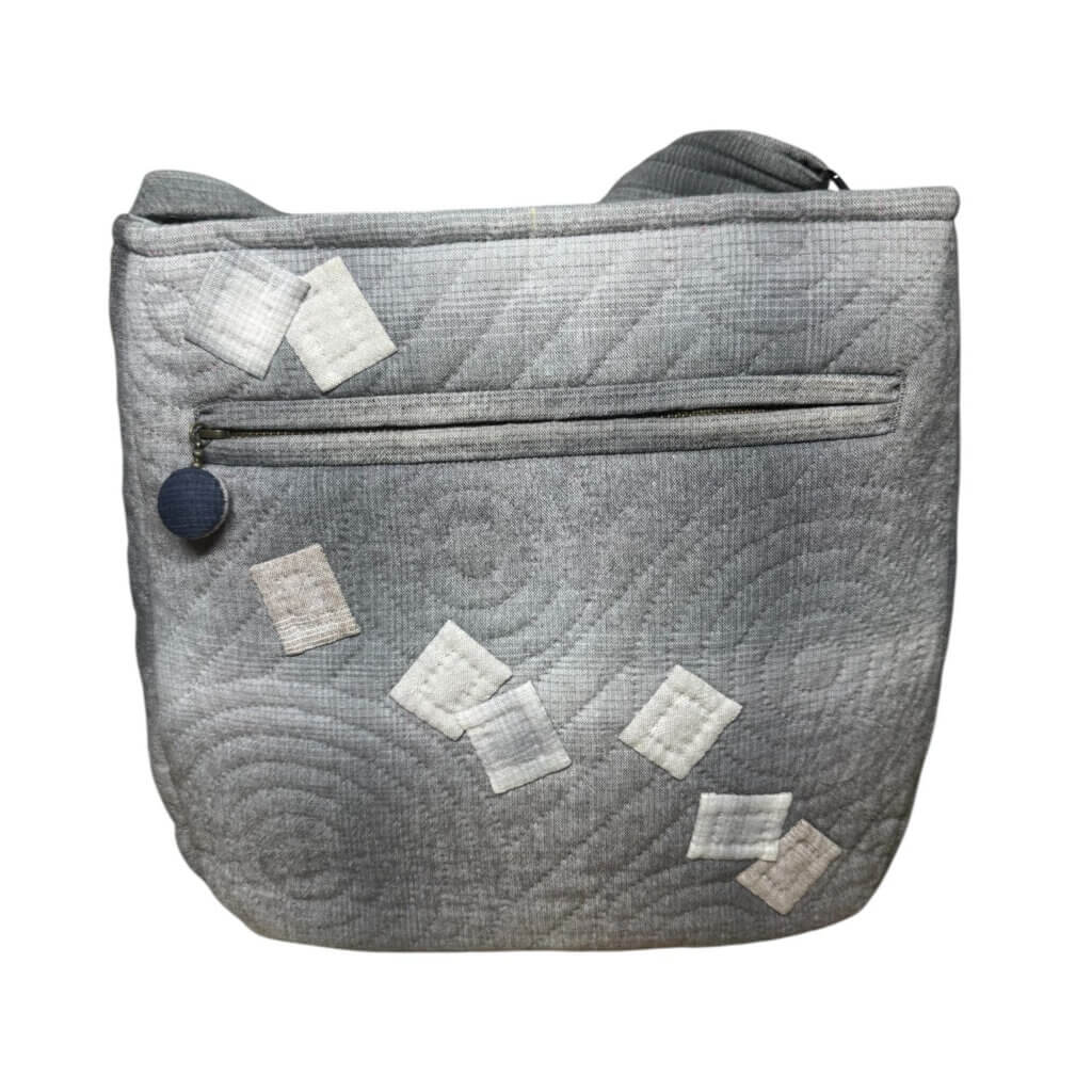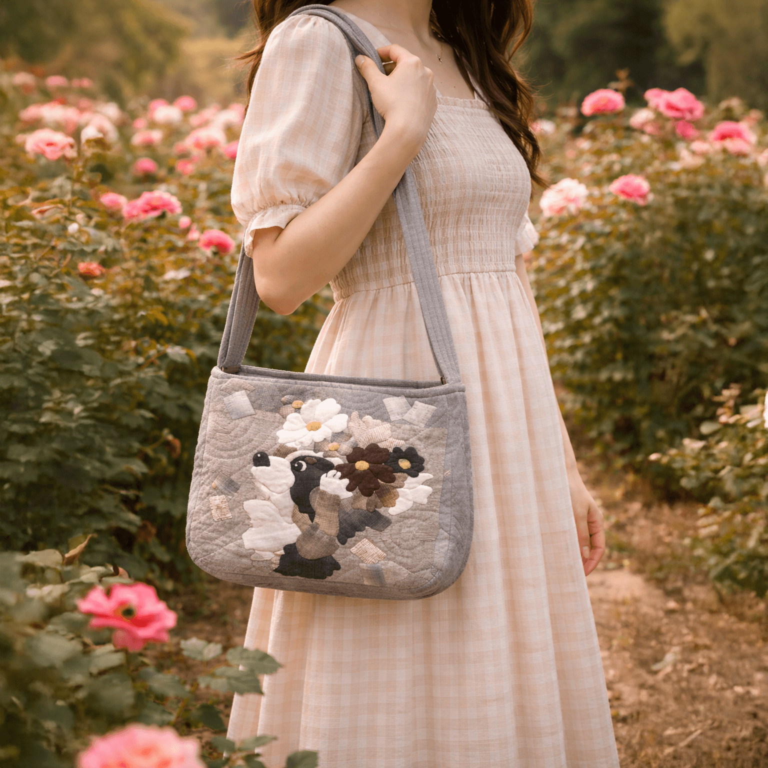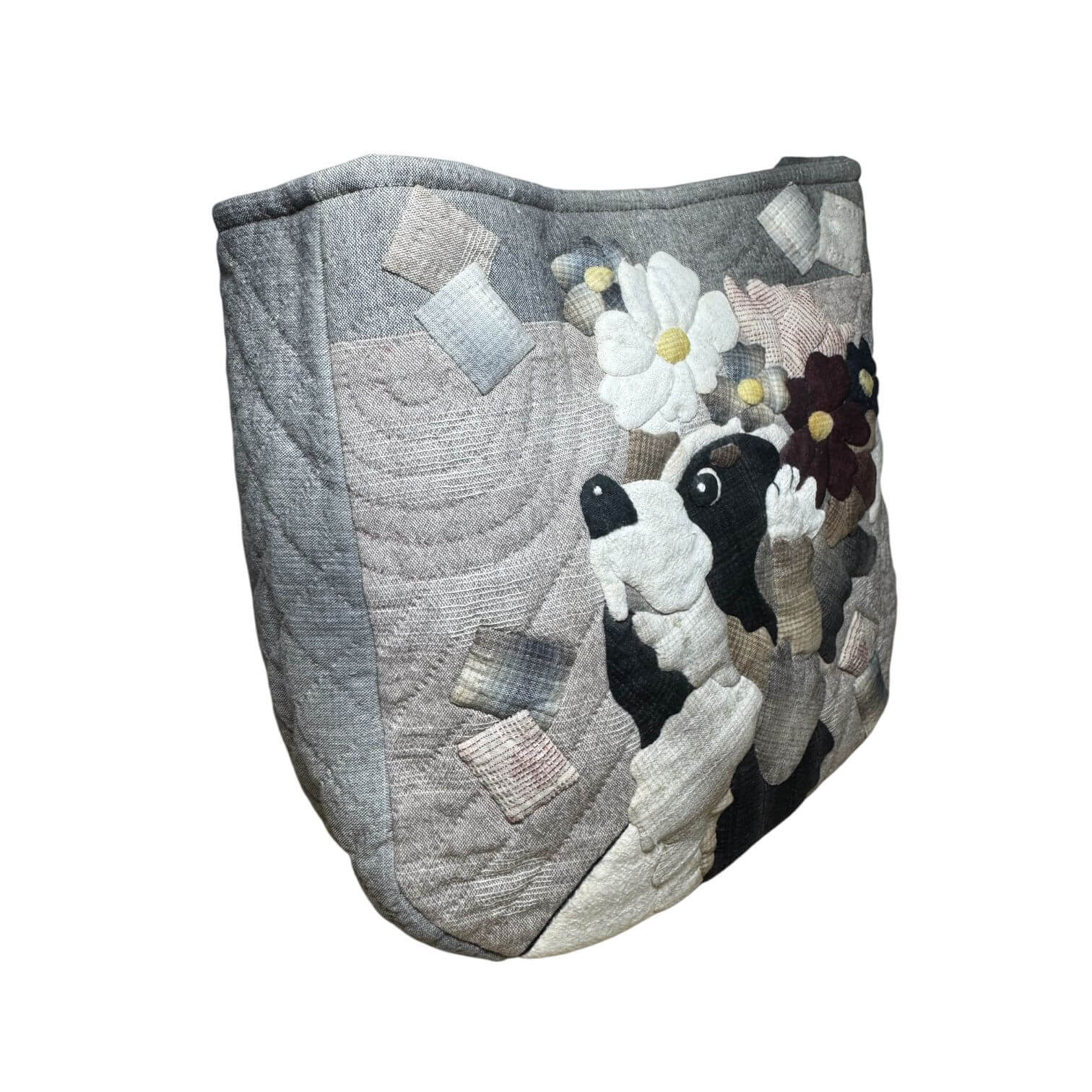 A charming handmade shoulder bag featuring a playful dog surrounded by floral appliqué, crafted with soft quilted fabric. Designed for everyday use, it’s lightweight, durable, and adds a unique, artistic touch to any outfit.